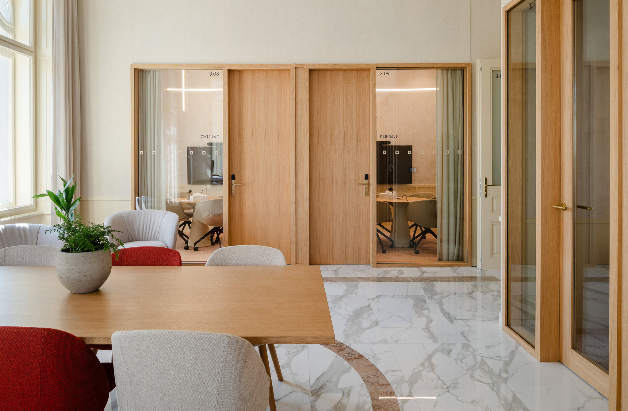 Design interiéru byl navržen tak, aby zachoval kouzlo původní architektury a zároveň splňoval potřeby současného pracovního prostředí. Prosklené příčky jsou klíčovým prvkem těchto prostor, neboť umožňují dostatek přirozeného světla, což přispívá k příjemné a produktivní atmosféře. Mobilní stěny poskytují flexibilitu, která je v moderních kancelářských prostorech nezbytná.