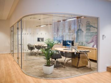 Akustické oddělení prostoru a možnost vytvářet místnosti bez rohů pomocí zaobleného skla. Systém dělících stěn GlassTech poskytuje nejen funkčnost, ale i estetický zážitek pro vaše pracovní prostory. Propojte kancelářský komfort s inovativním stylem díky GlassTech.