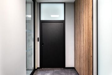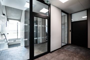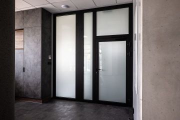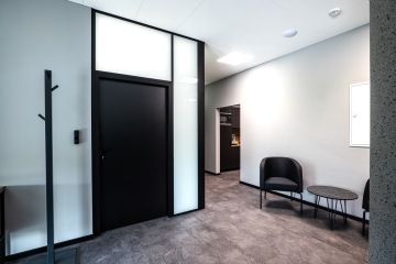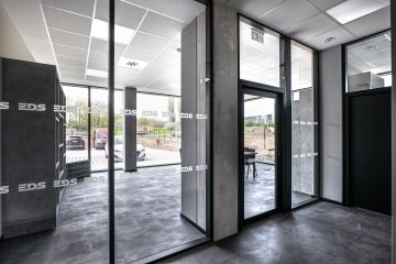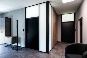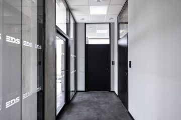 Nově vybudované moderní sídlo stavební společnosti EDS Trade v Krnově. Výroba a instalace designových interiérových příček MilTech a protipožárních stěn FireBo v černé barvě.