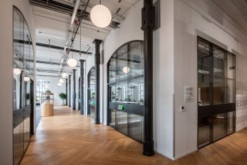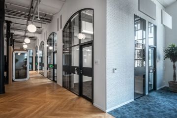 Jedinečná realizace dělících stěn pro společnost Microsoft v Bratislavě. Návrh a instalace interiérových příček MilTech v industriálních stylu. Precizní zpracování klenbových nadsvětlíků.